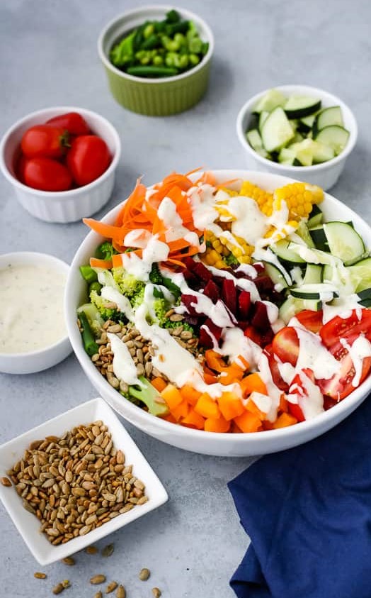 • Wypełnij je do polowy sosem Ranch i wyłóż na sos pokrojone warzywa.