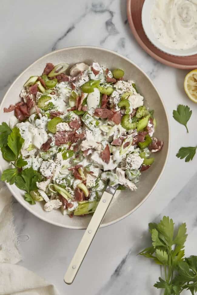 • Wyłóż do miski poszarpane mięso z kurczaka i pokrojony seler naciowy.