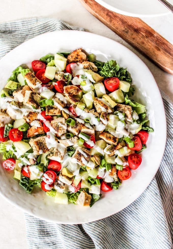 • Złóż sałatę, wyłóż do miski sałatkę rzymską, pokrojony kurczak, pomidory, ogórek i awokado.